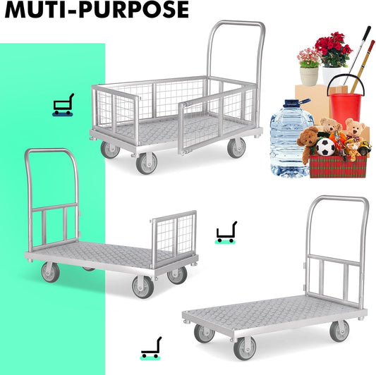 4-in-1 Platform Truck Cart with Cage, Multi-Purpose Heavy Duty Steel Flatbed Cart with 2200lbs Capacity Platform Hand Truck 6" Wheels Push Cart Dolly for Groceries, Garage, Warehouse (41“L x 24" W)