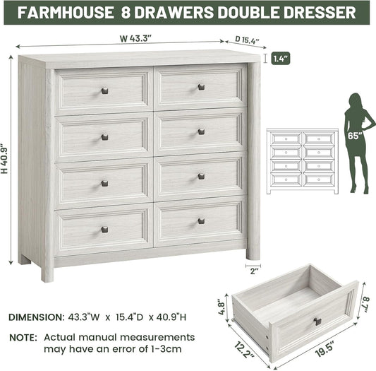 41" Tall White Dresser, Farmhouse 8 Drawers Dressers for Bedroom, Vertical Chest of Drawers for Bedroom Nursery with Metal Handle, Modern Rustic Wood Dresser for Closet, Living Room