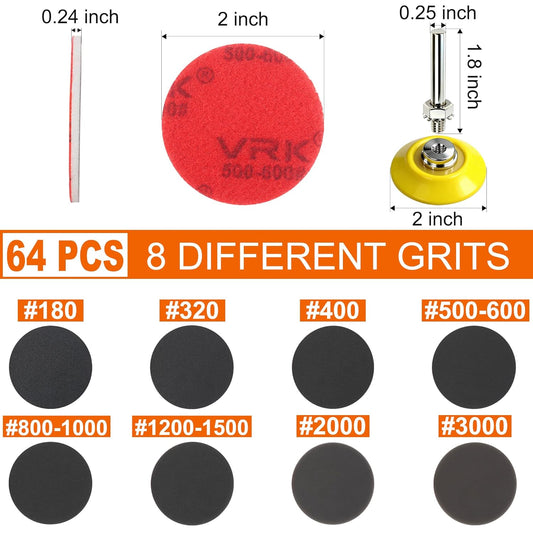 64 PCS 2 Inch Sanding Disc Pad,Hook and Loop Sanding Pads 180 to 3000 Wet Dry Sponge Sandpaper with 1/4” Shank for Drill Sanding Grinder Rotary Tools Curved Surface Polishing and Sanding