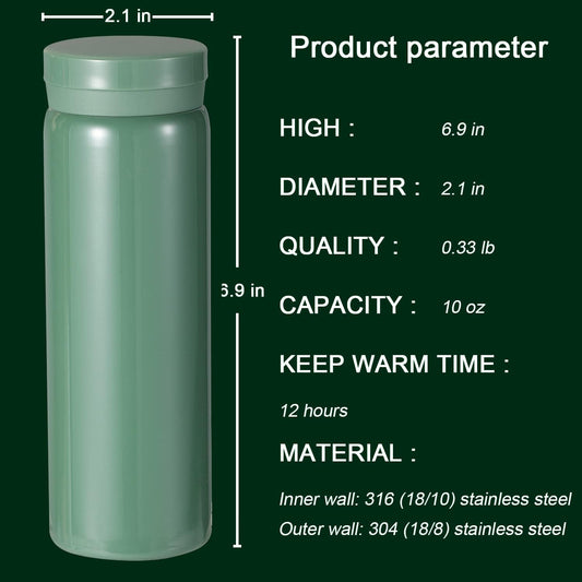 10oz Mini Water Bottle Stainless Steel Thermos Small Flask - Insulated Vacuum, Leak Proof, Keeps Drinks Hot/Cold - Ideal for Coffee, Tea, Water - Green