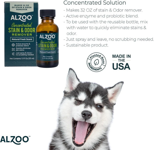 ALZOO Concentrated Stain & Odor Remover Bundle Bottle Set, Includes 32 Fl. Oz Refillable Bottle & 1.1 Oz. Concentrated Stain & Odor Remover, 100% Plant-Based Active Ingredients