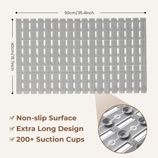 Bathtub Mat Non Slip Silicone Foldable Extra Long Tub Mat Strong Suction Cups & Large Drain Holes, Durable,Machine Washable for Smooth Surfaces Shower Mat, Ideal for Families Beige,15"x40" Grey