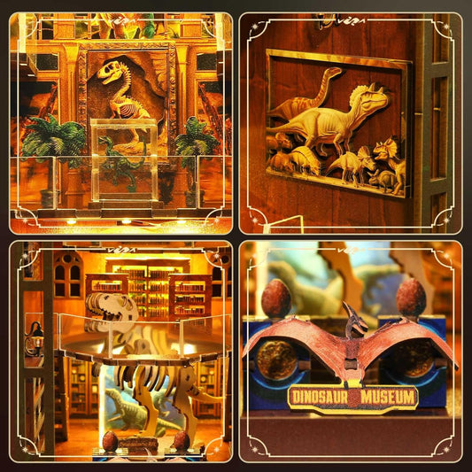 Book Nook Kit for Adults - DIY Dinosaur Museum Booknook, 3D Wooden Dollhouse Puzzle with LED Lights, Miniature Bookshelf Decor for Home Libraries
