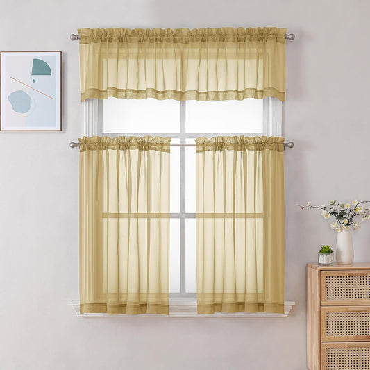 Chyhomenyc Gold Sheer Curtains 30 inch Length 2 Panels, Light Filtering Voile Rod Pocket Short Window Curtians for Bathroom Living Room Farmhouse Small Windows, 42Wx30L inches