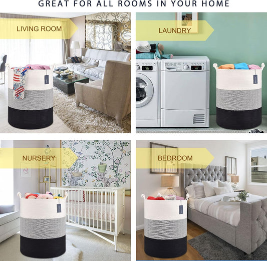 COMSE Extra Large Blanket Basket, Tall Woven Storage Basket, Nursery Hamper, 15.7”x 21.7”, Cotton Rope Laundry Hamper for Toys Clothes Towels, White/Gray/Black