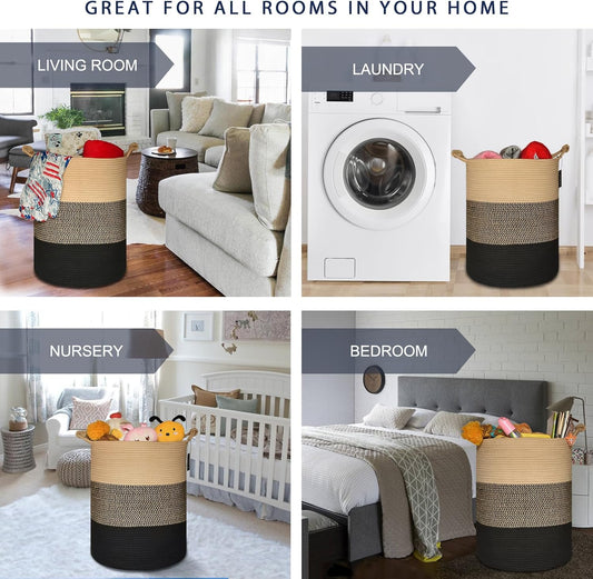 COMSE Extra Large Blanket Basket, Tall Woven Storage Basket, Nursery Hamper, 15.7”x 21.7”, Cotton Rope Laundry Hamper for Toys Clothes Towels, Brown/Black
