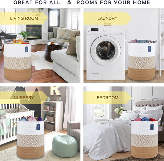 COMSE Extra Large Blanket Basket, Tall Woven Storage Basket, Nursery Hamper, 15.7”x 21.7”, Cotton Rope Laundry Hamper for Toys Clothes Towels, White/Camel