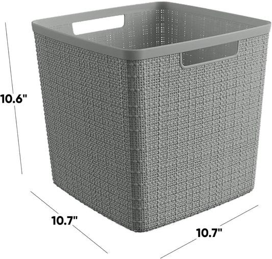 Curver Set of 4 Jute Large Cube Decorative Plastic Organization and Storage Baskets, Perfect Bins for Home Office, Closet Shelves, Kitchen Pantry and All Bedroom Essentials, Grey