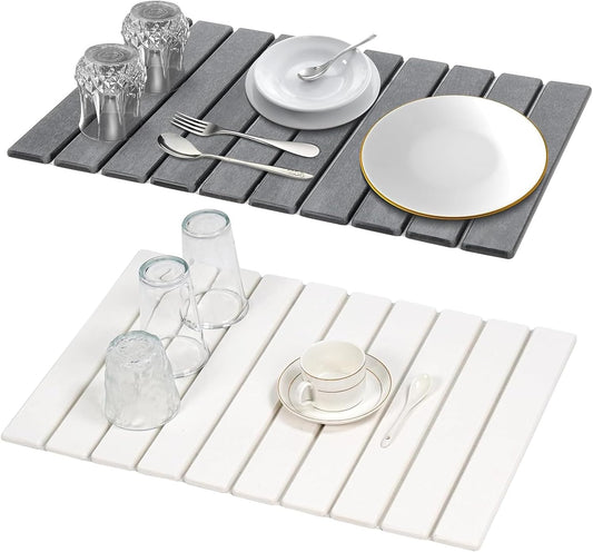 Diatomaceous Earth Stone Dish Drying Mat for Kitchen Counter – 24”x16”, Non-Slip Quick-Dry Surface, Sleek Foldable Design & Collapsible Storage, White