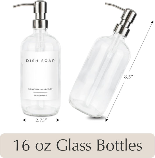 Emerson Essentials Glass Soap Bottle Dispensers, 2 Pack, Stainless-Steel Pumps Rust-Free, Hand Set for Bathroom Kitchen Sink, Liquid Lotion Shampoo Jars with 4 Waterproof Labels, 16 Oz Chrome