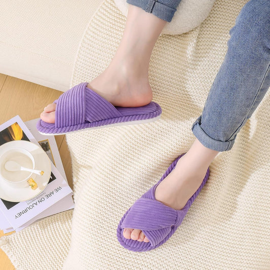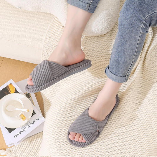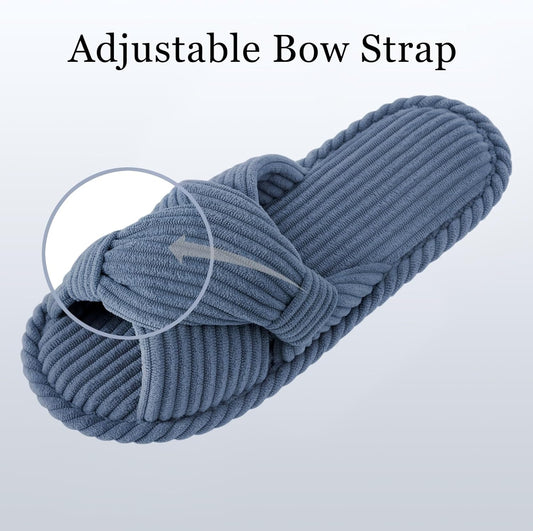 Evshine Summer House Slippers for Women Corduroy Cross Bow Indoor Slippers Open Toe Slip On Bedroom Shoes with Memory Foam