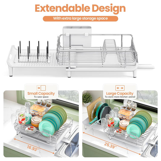 Expandable Dish Drying Rack, Foldable Dish Rack for Kitchen Counter, Stainless Steel Collapsible Dish Drainer Racks with Cutlery Holder, White