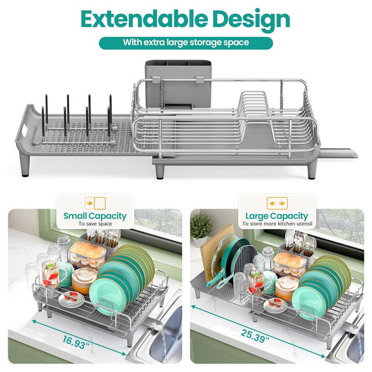 Expandable Dish Drying Rack,Foldable 304 Stainless Steel Dish Rack with Dual Parts, Extendable Dish Drainer Rack for Kitchen Counter, Dish Drying Rack with Cutlery Holder Gray