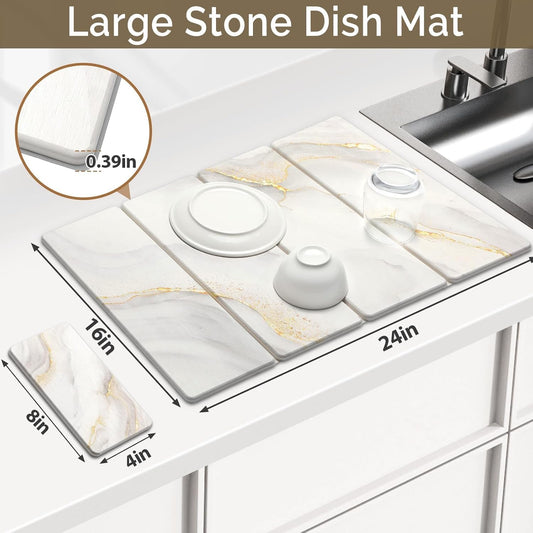 2 PCS Large Stone Dish Drying Mat for Kitchen Counter,Quick Dry Stone Dishes Mats,Marbled Water Absorbing Diatomaceous Earth Drying Pad for Countertop Bottles Utensils Cups(Gold White 24"x16"&8"x4")