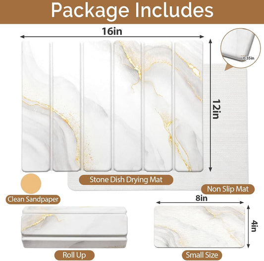 2 PCS Stone Dish Drying Mat for Kitchen Counter,Quick Dry Stone Dishes Mats,Marbled Water Absorbing Diatomaceous Earth Drying Pad for Countertop Bottles Utensils Cups(Gold White 16"×12" & 8"x4")