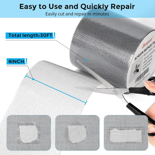 Grey Window Screen Repair Kit, 4 in X 30 FT (360IN) Screen Repair Tape for Windows or Doors, Strong Adhesive Fiberglass Mesh Patch Tape