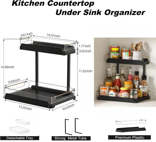 heart & home 2-Pack Under Sink Storage Organizer for Kitchen & Bathroom Cabinets with Removable Washable Tray, Tool-Free Assembly – Multi-Purpose for Vanity, Laundry & Countertop, Black