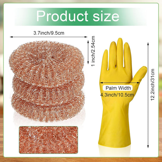 Hushee 50 Pack Copper Coated Scourers Rust Resistant Scrubbing Scouring Pad with 1 Pair of Rubber Household Cleaning Gloves Heavy Duty Copper Mesh Scourer for Dishes, Pots, Pans, and Ovens