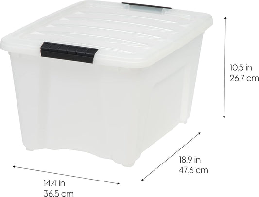 IRIS USA 19 Qt Stackable Plastic Storage Bins with Lids, 4 Pack - BPA-Free, Made in USA - See-Through Organizing Solution, Latches, Durable Nestable Containers, Secure Pull Handle - Clear