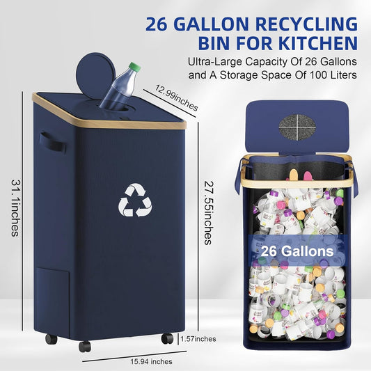 26 Gallon Recycling Bin for Kitchen, 100L Recycle Bin with Lid, Recycle Bins for Kitchen with 4 Wheels(Lockable),2 Reusable Inner Bags, for Bottle Can Glass Plastic Stickers, Dark Blue