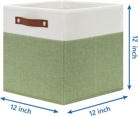 Temary 12 Inch Fabric Storage Cubes Storage Bins with Leather Handles, 4 Pack Cube Baskets Bins for Organizing Closet, Foldable Cloth Baskets for Shelves (White&Green)