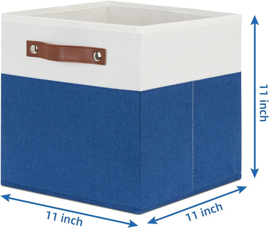 Temary 11 Storage Cube Bins for Shelves, Closet - 4 Pack Fabric Baskets With Leather Handles (White & Blue)