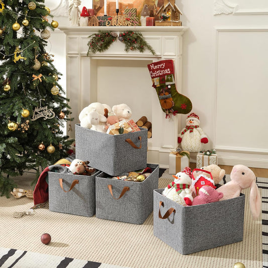 Temary 12x12 Storage Cube Bins 4 Pack Fabric Storage Cubes Storage Bins with Leather Handles, Storage Baskets Foldable Cube Organizers Bins for Home (Grey)