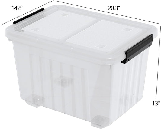 80 L Large Clear View Plastic Storage Bin with Lid and Secure Latching Buckles, 4-Pack Wheeled Clear Storage Boxes