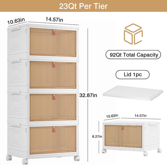 VECELO 4 Tier Storage Bins with Lid, Stackable Storage Boxes with Magnetic Doors & Wheels, Foldable Storage Containers, 23 QT Closet Organizers and Storage for Living Room, Office, Dorm