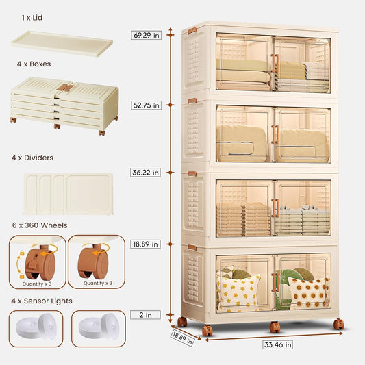 752QT/188Gal 4 Layers Stackable Storage Bins with Lid & Doors - Sensor Lights in Cabinets, Large Collapsible Container Box with 6 Wheels, Plastic Foldable Organizer for Home