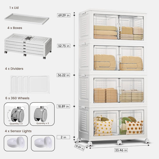 752QT/188Gal 4 Stackable Storage Bins with Lid and 8 doors, Motion Sensor Lights in Cabinets, Large Collapsible Container Box with 6 Wheels, Plastic Foldable Organizer for Home - Pure White