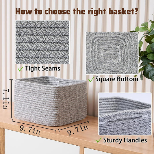 Small Organizing Baskets for Cubes Shelf, 9.7x9.7x7.1 Inch Rope Woven Storage Bins for Nursery Shelves Storage, Cute Toy Basket, Square 3 Packs Mixed Grey