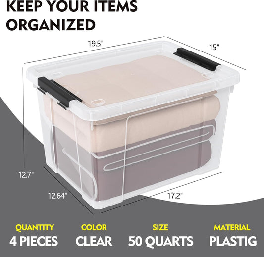 4 Pack Large Clear Plastic Storage Bins with Latching Lids, 50 Quart Plastic Storage Container with Wheels, Clear
