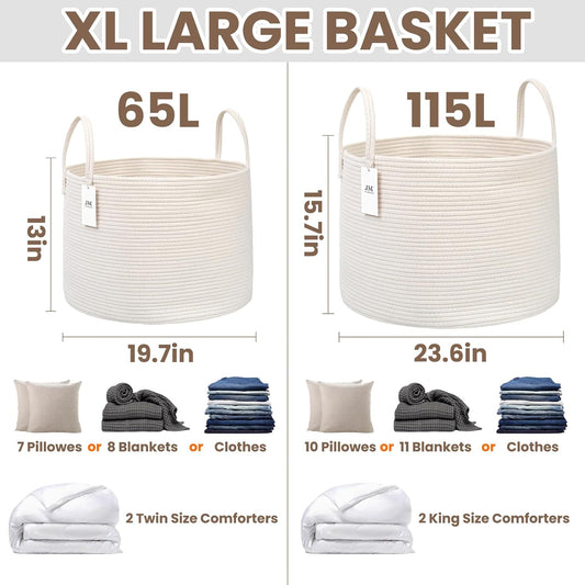 Woven Blanket Basket,115L Large Rope Storage Bin with Handles, Organizer for Blankets Toys Book and Clothes, Laundry Basket for Living Room Bedroom Nursery,White