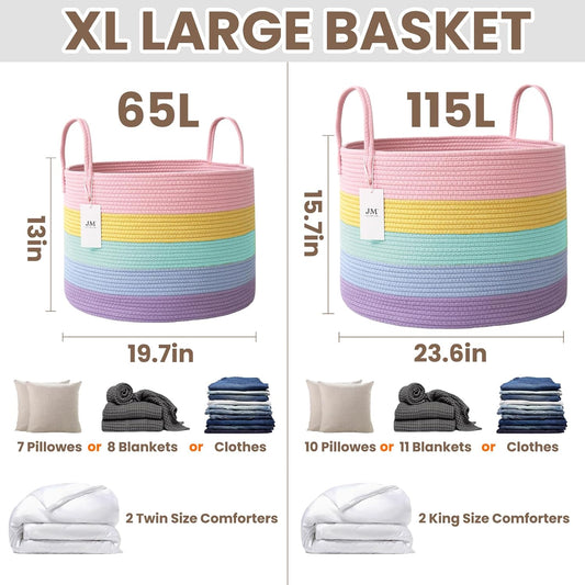 Woven Blanket Basket,65L Large Rope Storage Bin with Handles, Organizer for Blankets Toys Book and Clothes, Laundry Basket for Living Room Bedroom Nursery,Rainbow