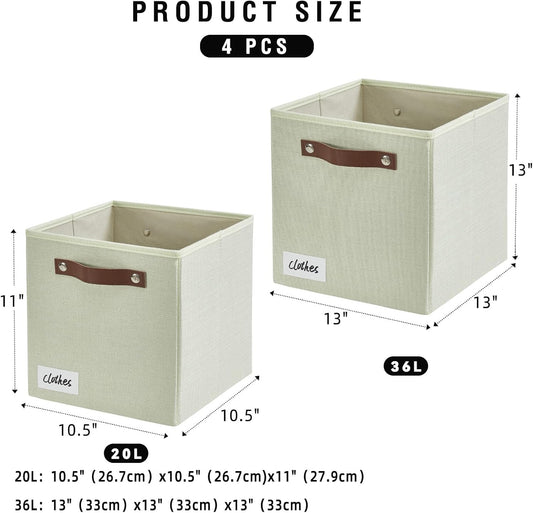 Collapsible Fabric Storage Cube Bins with 2 Reinforced PU Handles, Foldable Storage Organizer Baskets for Closet, Shelves, Living Room | 13"x13"x13", 4 Pack, Full Beige