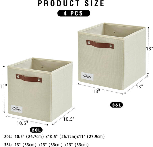 Collapsible Fabric Storage Cube Bins with 2 Reinforced PU Handles, Foldable Storage Organizer Baskets for Closet, Shelves, Living Room | 11"x11"x11", 4 Pack, Full Beige