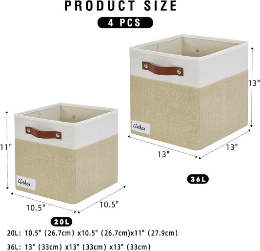 Collapsible Fabric Storage Cube Bins with 2 Reinforced PU Handles, Foldable Storage Organizer Baskets for Closet, Shelves, Living Room | 11"x11"x11", 4 Pack, Beige & White