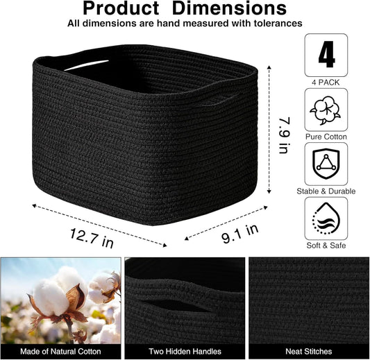 Small Storage Baskets for Organizing Shelves, Cotton Rope Basket for Storage, Cute Rectangular Book Toy Bins, 12.7"×9.1"×7.9", 4 Packs, Black