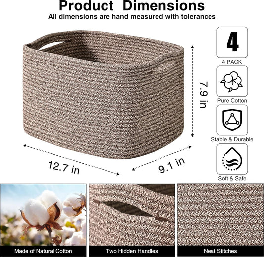 Small Storage Baskets for Organizing Shelves, Cotton Rope Basket for Storage, Cute Rectangular Book Toy Basket, 12.7"×9.1"×7.9", 4 Packs, Dark Brown