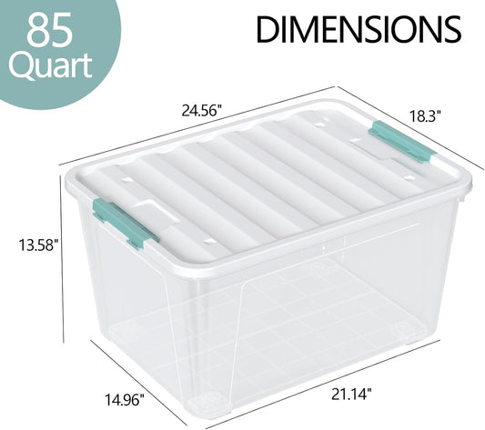 Zopnny 2-Pack Large Latching Box, 85 Quart Plastic Storage Bin with Lid, Stackable Totes w/Wheels, Clear