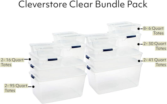 Rubbermaid Cleverstore Clear Dorm Variety 16-Pack, Made in USA, Stackable Large Clear Storage Bins with Lids, See-Through Plastic Storage, with Latching Lids, BPA-Free