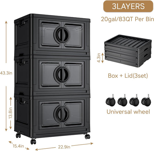 JEKO&JEKO 249Qt Lockable Stackable Storage Bins with Lids, Collapsible Closet Organizer with Wheels, Plastic Cabinet Drawer for Clothes, Dorm Room 3 Pack (Black)