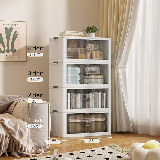 JEKO&JEKO 332Qt Lockable Stackable Storage Bins with Lids, Collapsible Closet Organizer with Wheels, Plastic Cabinet Drawer for Clothes, Dorm Room 4 Pack (White)