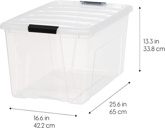 IRIS USA 72 Qt Stackable Plastic Storage Bins with Lids, 4 Pack - BPA-Free, Made in USA - See-Through Organizing Solution, Latches, Durable Nestable Containers, Secure Pull Handle - Clear