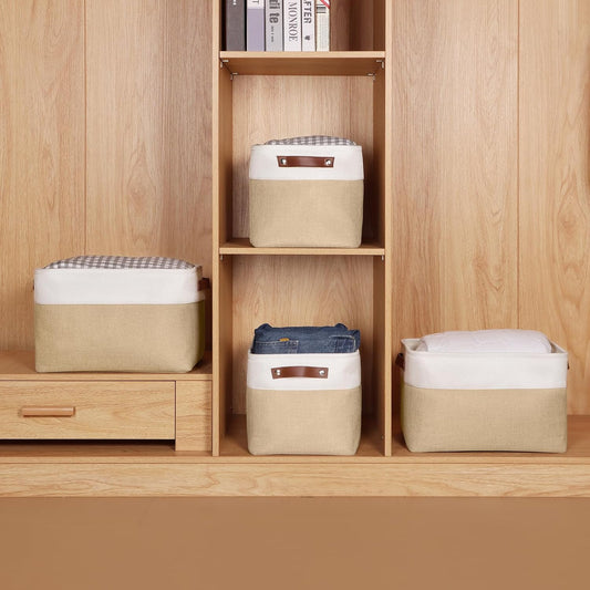 Univivi 4 PC 13 Inch Cube Storage Baskets with Hard Bottom for Shelves Foldable Storage Baskets for Closet Storage Clothes,Cube Storage Bin, Storage Basket with Handles for Organizing (Khaki)
