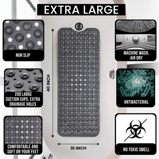 ENKOSI Bathtub Mat – 40 x 16 Inch Extra Long Non Slip Shower Mat – Anti Slip Grey Bath Mat with Suction Cups and Drain Holes – Bathroom Mat for Smooth Tubs and Shower Floors (40x16 Clear Grey)