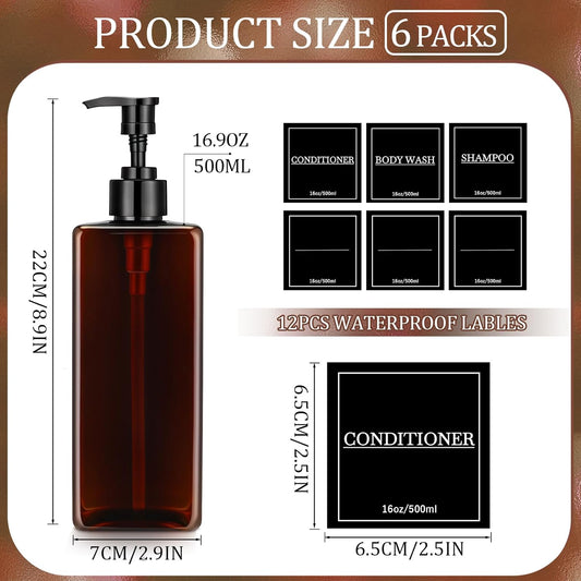 Tanlade 6 Pcs Shampoo and Conditioner Dispenser Bottles 16oz Modern Shower Soap Bottles with Pump, Labels and Marker Pen Easy to Refill Body Wash Dispensers for Home Bathroom Decoration(Brown)