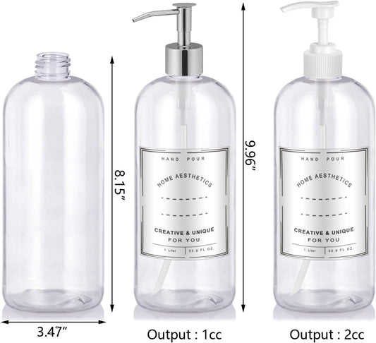 Refillable 32oz Dispenser Plastic Bottle 2pack with Steel Pumps, 1 Liter Crystal Clear Multi-Use Empty Container with Funnel for Shampoo, Conditioner, Body Wash, Liquid Hand Soap, Lotion