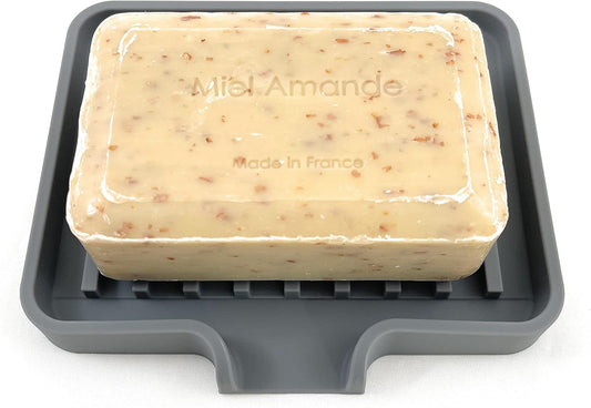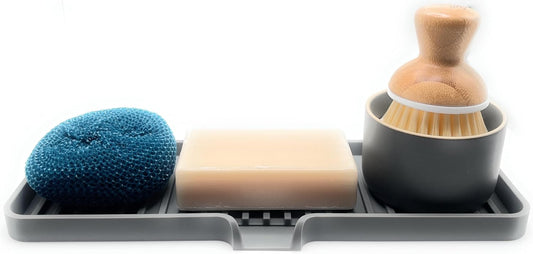 Happitasa Silicone Soap Dish Tray and Sponge Holder with Drain Chute | Bathroom and Kitchen Sink Organizer Caddy (Grey, 9"x3.5", 5.6 Ounces)